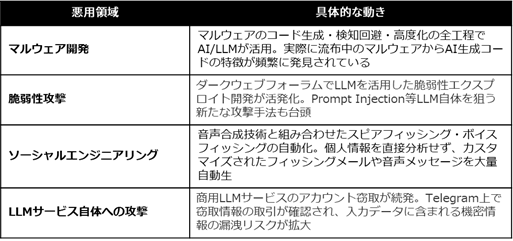 2025年、生成AIはサイバー攻撃の「武器」として本格的に活用され始めています。報告書では、以下の4つの領域で具体的な悪用事例が確認されています。