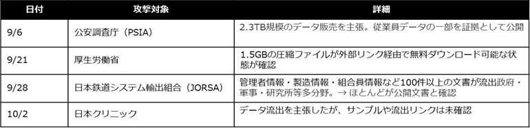 日本での被害は計3件で、国別ランキングの全体3位に位置します。業種を問わない無差別的な攻撃手法の性質上、あらゆる日本企業が潜在的な標的となり得ます。なお、2025年10月20日に主要メンバーの逮捕を理由として活動中断を告知しましたが、わずか1か月後には新たなTelegramチャネルを開設し、活動継続を宣言。実質的な脅威は継続しており、継続的な監視が不可欠です。