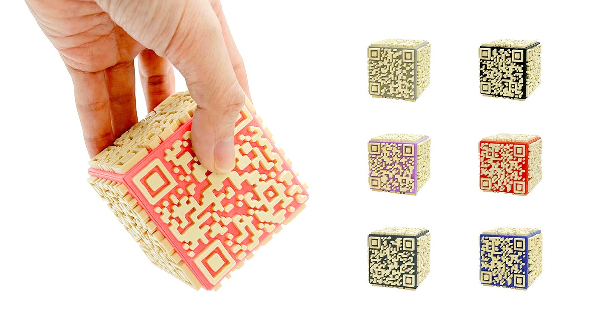 情報への入口として日常的に目にしているQRコードを、平面ではなく空間の中で成立させることはできないか。そうした試行錯誤の末に生まれたのが、六面すべてにQRコードを配置した立体型のオブジェです。