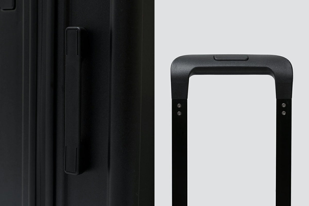 トップとサイドの2箇所にハンドルを備え、持ち上げや荷物棚への収納時にもスムーズに扱えます。さらにブラック塗装のアルミ製レバーハンドルは2段階調節が可能(※36Lのみ)で、高い剛性による安定した操作性を実現。石畳などの荒れた路面でも快適な取り回しが可能です。