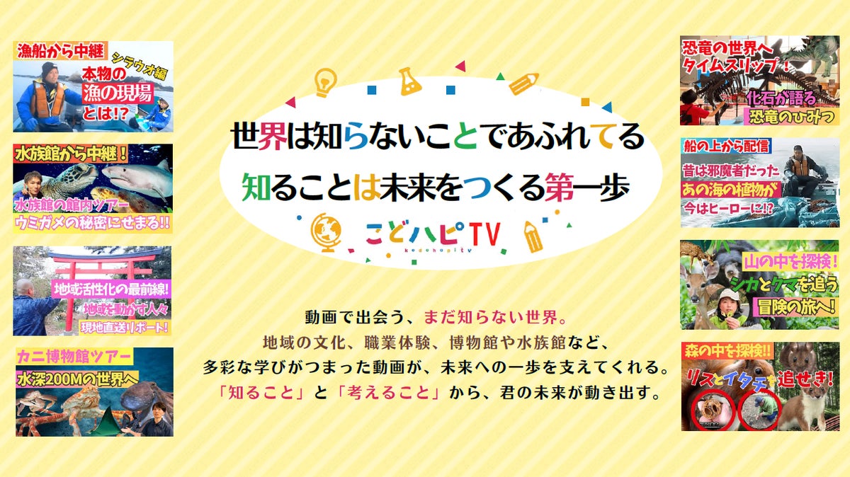 こどハピTVは、動画を通じて子どもたちが“まだ知らない世界”に出会えるデジタル教育プログラムです。地域の文化や職業体験、博物館・水族館など、多彩なテーマを分かりやすく紹介し、「知ること」「考えること」へとつなげる学びを提供します。