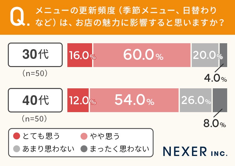 一方、「あまり思わない」は30代が20.0%、40代が26.0%でした。「まったく思わない」は30代が4.0%、40代が8.0%と、40代のほうがメニューの更新を気にしない割合がやや高い結果となりました。