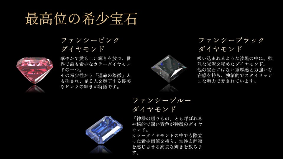 カラーダイヤモンドの中でも際立った希少価値を持ち、知性と静寂を感じさせる高貴な輝きを放ちます。
