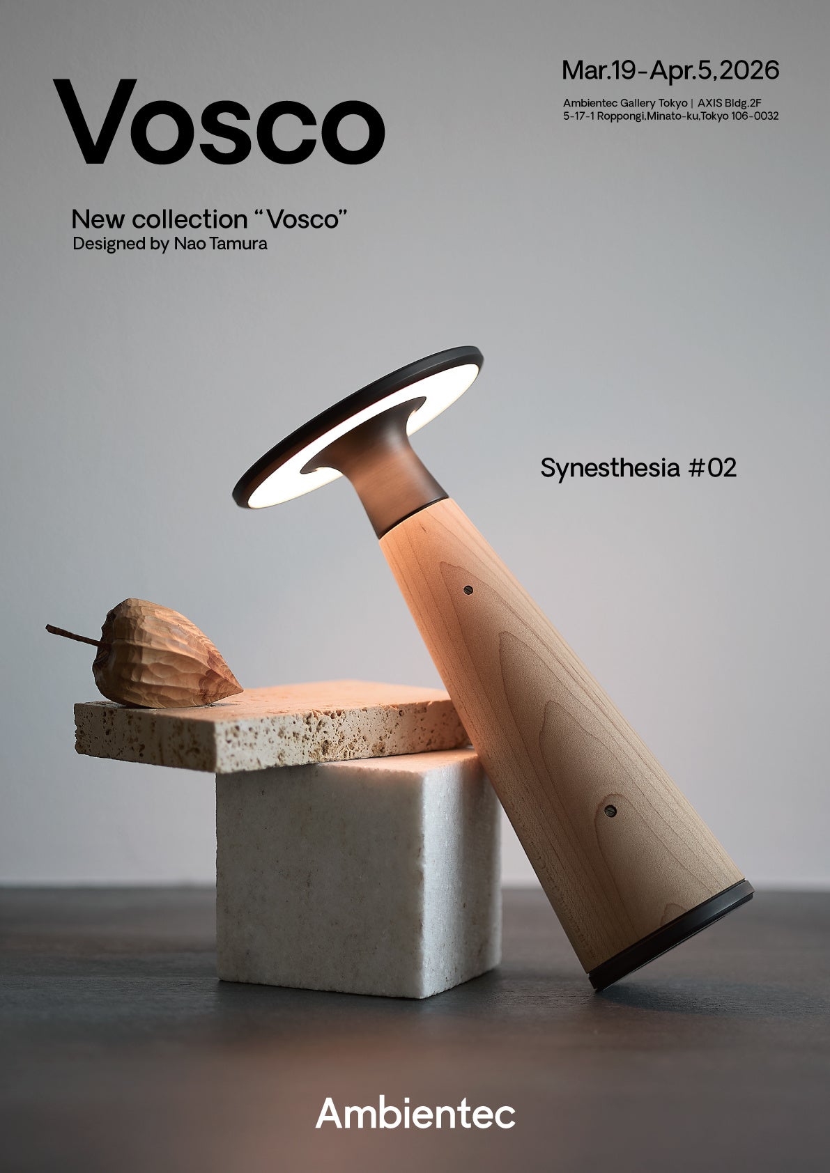 直営店舗であるAmbientec Gallery Tokyoでは、Synesthesia #02 (シナスタジア~共感覚 #02) と題した発売記念イベントを3月19日 (木) ~4月5日 (日) まで開催。期間中、アンビエンテックと深い関わりがあるアルゼンチン発のペルフーメラボラトリー「FUEGUIA 1833」の香り、Dawn of MidiやKali Maloneなどの音楽と共に、灯りと香りと音楽とでVoscoの世界観を感じていただける展示をいたします。