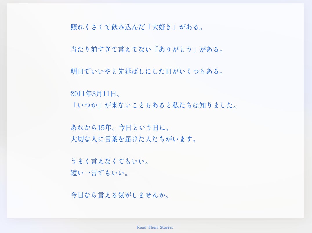 東日本大震災から15年。一晩で共感の輪が広がり、3万PVを突破。大切な人へ宛てた手紙の特設サイト「#今日なら言える気がする」公開。