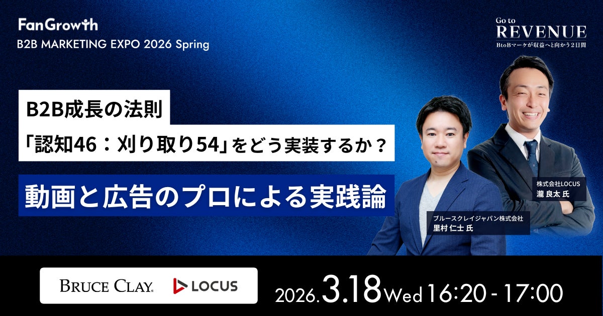 動画を起点として2,000社以上の企業にコンサルティング事業を展開する株式会社LOCUS(東京都千代田区、代表取締役 瀧良太)は、エキサイト株式会社が主催する、2026年3月18日(水)~19日(木)の4日間にわたり開催される大型カンファレンス「B2B MARKETING EXPO 2026 Spring~Go to Revenue BtoBマーケが収益へと向かう2日間~」に登壇することをお知らせいたします。