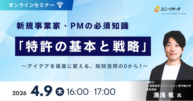 ダイレクトリサーチプラットフォーム「ユニーリサーチ」を運営する株式会社プロダクトフォース(本社:東京都港区、代表取締役CEO 浜岡 宏樹、以下「プロダクトフォース」)は知財戦略の専門家である弁理士/iU 情報経営イノベーション専門職大学 客員教授の湯浅 竜氏を招き、オンラインウェビナー「新規事業家・PMの必須知識『特許の基本と戦略』 ~アイデアを資産に変える、知財活用の0から1~」を2026年4月9日(木)16:00~17:00に開催いたします 。