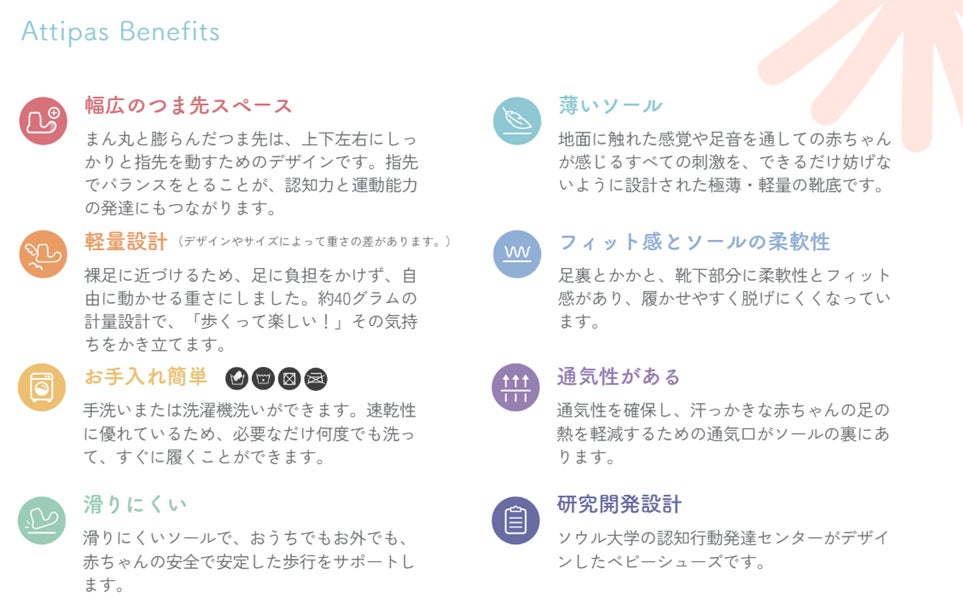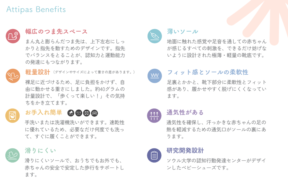Attipas(アティパス)は、成長によって変化する赤ちゃんの足に着目し、産学共同で7年にも及ぶ研究の結果に基づいて作られた歩育シューズです。歩き始めの赤ちゃんにとって大切な「裸足の感覚」に近づけて作られており、靴選びに大切なポイントが詰まっています。2011年にスタートし、今ではオーストラリア、スペイン、アメリカなど世界30ヵ国以上のママやパパに愛される安心、安全のブランドです。