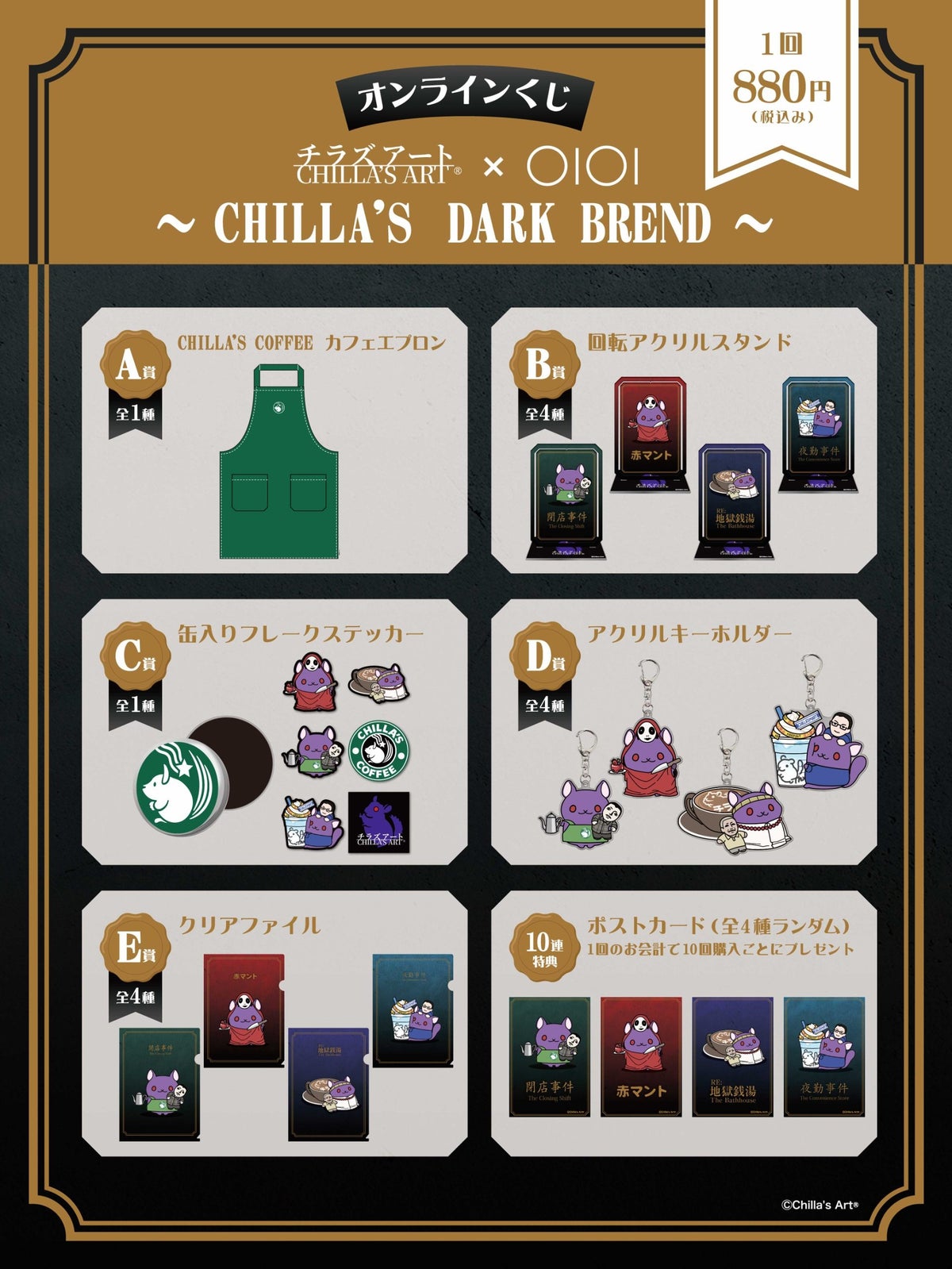 A賞:カフェエプロン、B賞:回転アクリルスタンド、C賞:缶入りフレークステッカー、D賞:アクリルキーホルダー、E賞:クリアファイルのほか、10連特典としてポストカードをご用意しています。
