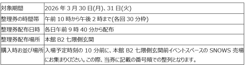 3月25日(水)~3月31日(火)の期間でアプリ・紙整理券をお持ちの方をご案内後、在庫が残っている場合は午後3時から”フリー入場”としてご案内いたします。