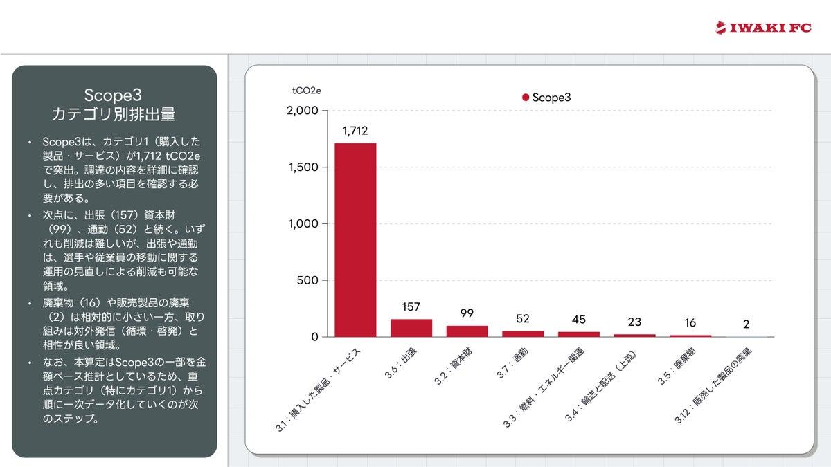 Scope 3が全体の9割以上: 排出の大部分(約94%)はサプライチェーンに関連するものです。特に「購入した製品・サービス」が 1,712 tCO2e と突出しており、その中でも販売用グッズの仕入(785 tCO2e)や、トップチーム運営費 ※特に食事など(231 tCO2e)が大きな割合を占めています 。