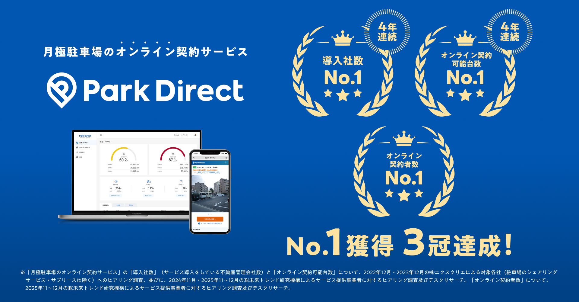 「Park Direct(パークダイレクト)」(https://www.park-direct.jp)は、駐車場にまつわるあらゆる業務(集客・契約・決済・顧客管理)を一気通貫でデジタル化するモビリティSaaSです。月極駐車場の各種手続き(※2)を全てオンラインで完結させ、不動産会社様や借主様の駐車場契約・管理にまつわるアナログなプロセスを大幅に削減します。さらに、駐車場ごとのデータに基づきオンライン/オフラインを問わない様々な集客施策を設計、展開し、月極駐車場の稼働率アップ、オーナー様の収益アップに貢献いたします。
