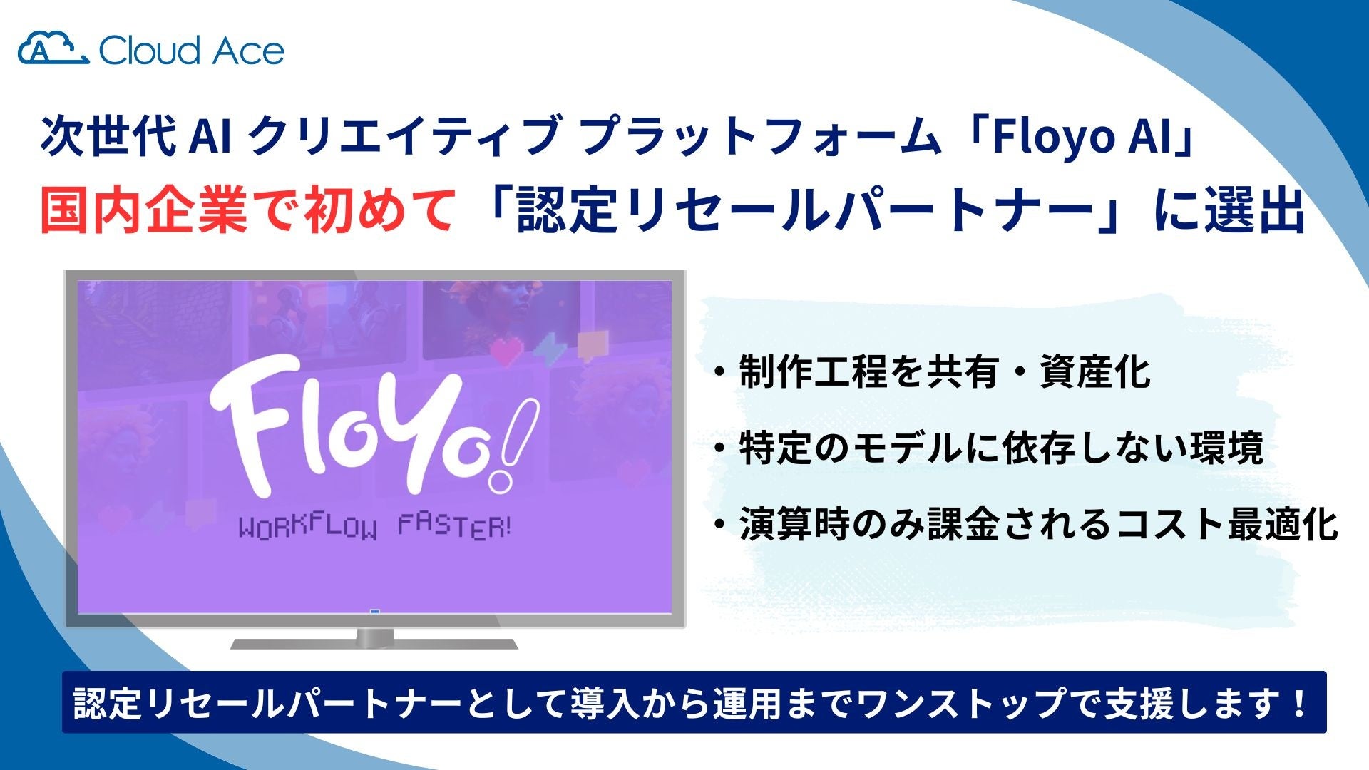 クラウドエース株式会社(本社:東京都千代田区、代表取締役社長:吉積 礼敏、以下クラウドエース)は、2026 年 3 月 12 日、Think Diffusion Inc.(本社:米国テキサス州、以下 ThinkDiffusion)が提供する、オープンソースの生成 AI ワークフロー プラットフォーム「Floyo AI(フロヨエーアイ)」の取り扱いを開始いたします。これに伴い、同サービスの国内初のリセールパートナーとして認定されましたことも、あわせてお知らせいたします。