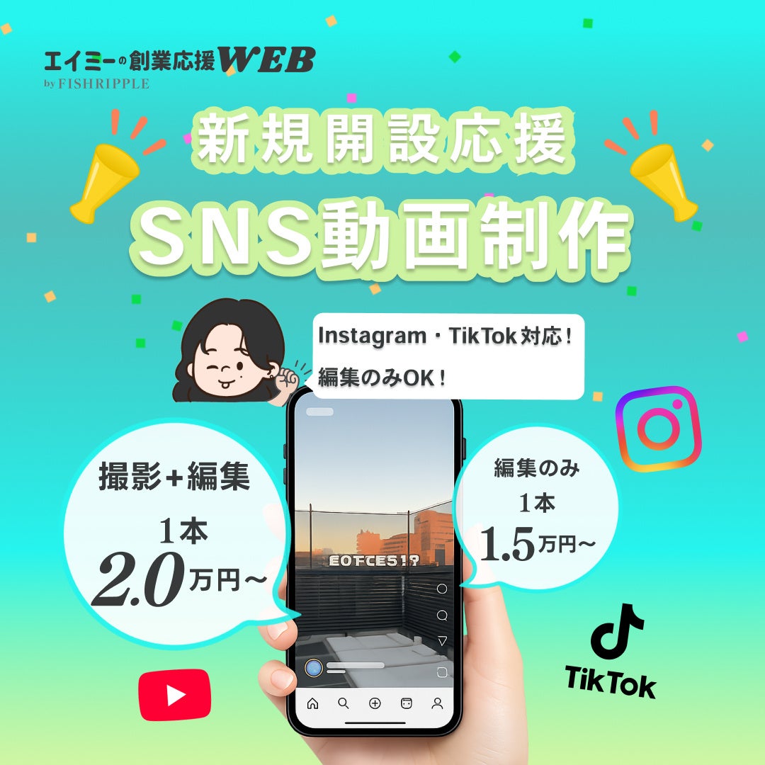 2. 新規開設応援!SNS動画制作特徴: InstagramやTikTokの本格的なショート動画を試しやすい価格で制作。商品・サービス紹介やPR、企業ブランディング、採用活動等に役立ちます。編集のみの対応も可能です。