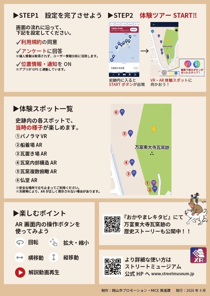岡山市産業観光局観光部プロモーション・MICE推進課(岡山市北区大供一丁目1番1号)は、令和8年3月5日(木)、岡山市東区瀬戸町万富にある史跡「万富東大寺瓦窯跡」で、東大寺の瓦の製造の様子を最新のCGで再現したARコンテンツを公開しました。