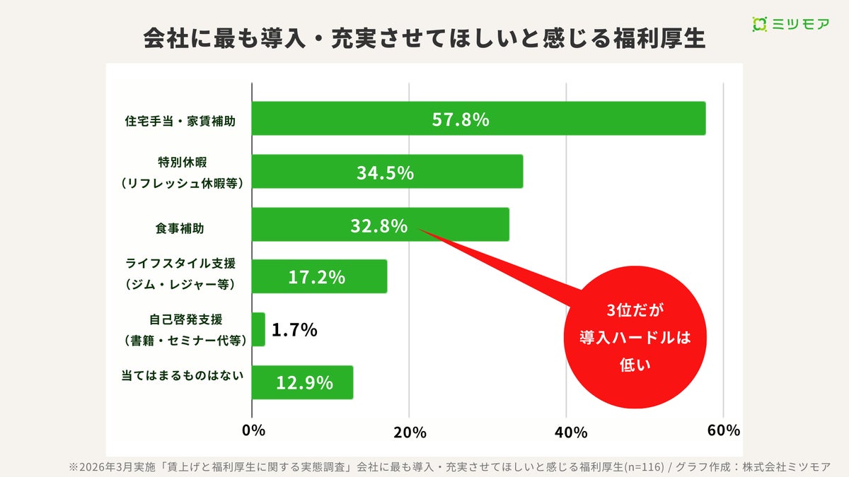 若手が最も求める福利厚生は「住宅手当」(58%)が圧倒的1位。食事補助(33%)は3番手--万能薬ではないが、非課税メリットを持つ食事補助が労使の「落としどころ」に