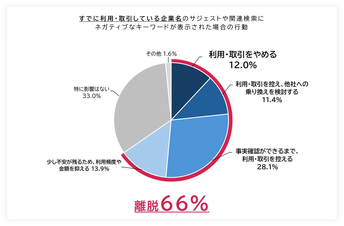 その結果、検索結果にネガティブワードが表示されるだけで、最大約80%が行動を控えることが明らかになり、検索結果が企業の第一印象を左右し、問い合わせ・採用・取引・既存顧客など企業活動全体に影響を及ぼす 「検索リスク」 の存在が浮き彫りとなりました。