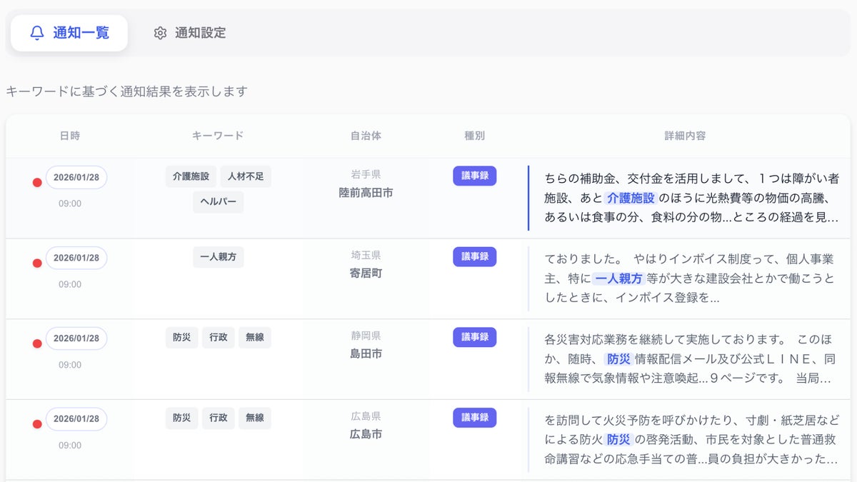 LobbyAIは、行政リサーチや政策トラッキングにとどまらず、企業の自治体営業や政策渉外における提案機会の発見までを支援する政策データベースとして、公共市場における意思決定を支援しています。