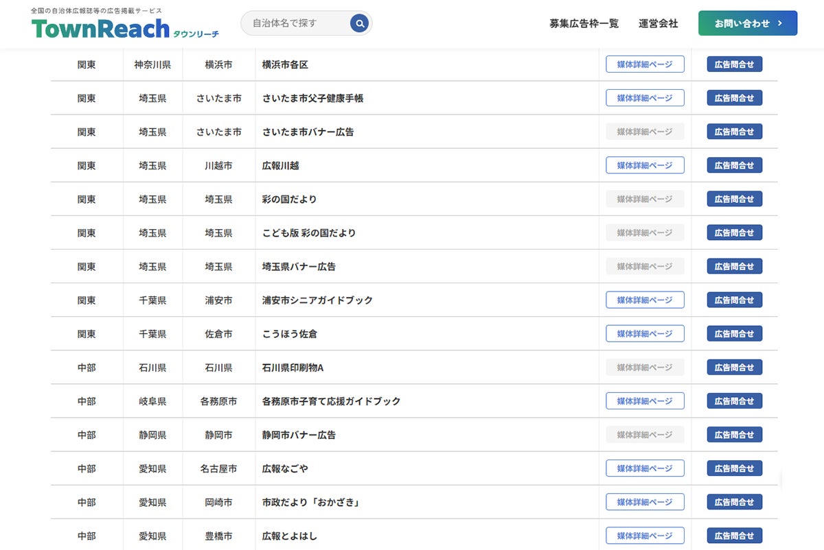このほか全国の多数の自治体広報誌広告などを取り扱っており、掲載可能媒体や広告料金、掲載までの流れなどについて案内しています。
