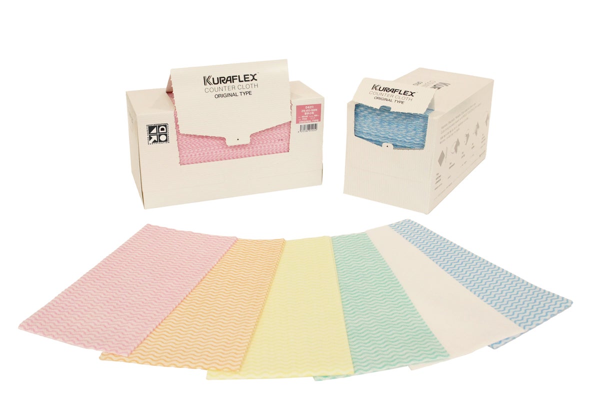 <クラフレックス>カウンタークロスは、汚れ落ちの良さと乾燥の速さにより雑菌が繁殖しにくいことが特長のふきんで、1972年からスーパーマーケットや飲食店で幅広く使用されてきた商品です。2024年12月でクラレクラフレックス株式会社様での生産が終了となり、昨年より株式会社クラレの技術協力・ご支援の下、引き継ぎ当社で企画販売しております。