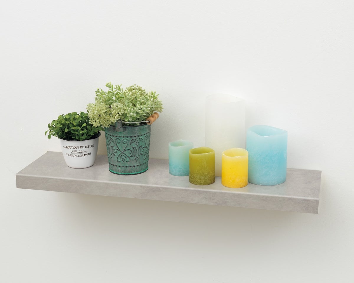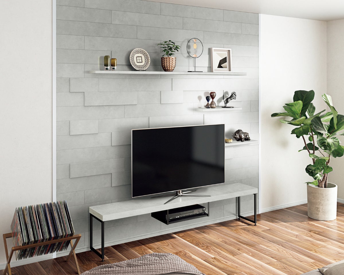 厚みの異なる高意匠の小割壁材を組み合わせた壁材のウォールデコ。大切な小物を飾っていつものリビングをショップのような空間に演出するシェルフデコに新たに異素材柄が新登場。