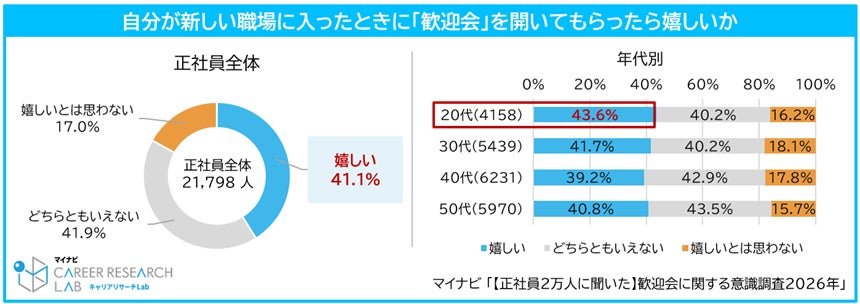 ◆20~50代正社員の4割以上が新しい職場で歓迎会を開いてもらうことは「嬉しい」。「嬉しい」と感じる割合は20代が43.6%で最多