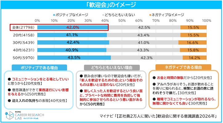歓迎会のイメージについて聞いたところ、全体では「ポジティブなイメージ」が42.0%、「どちらともいえない」が42.5%で最多、「ネガティブなイメージ」は15.5%だった。