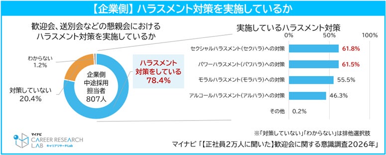 企業の中途採用担当者に「歓迎会、送別会などの懇親会におけるハラスメント対策を実施しているか」を聞くと、78.4%が何らかのハラスメント対策を実施していると回答した。