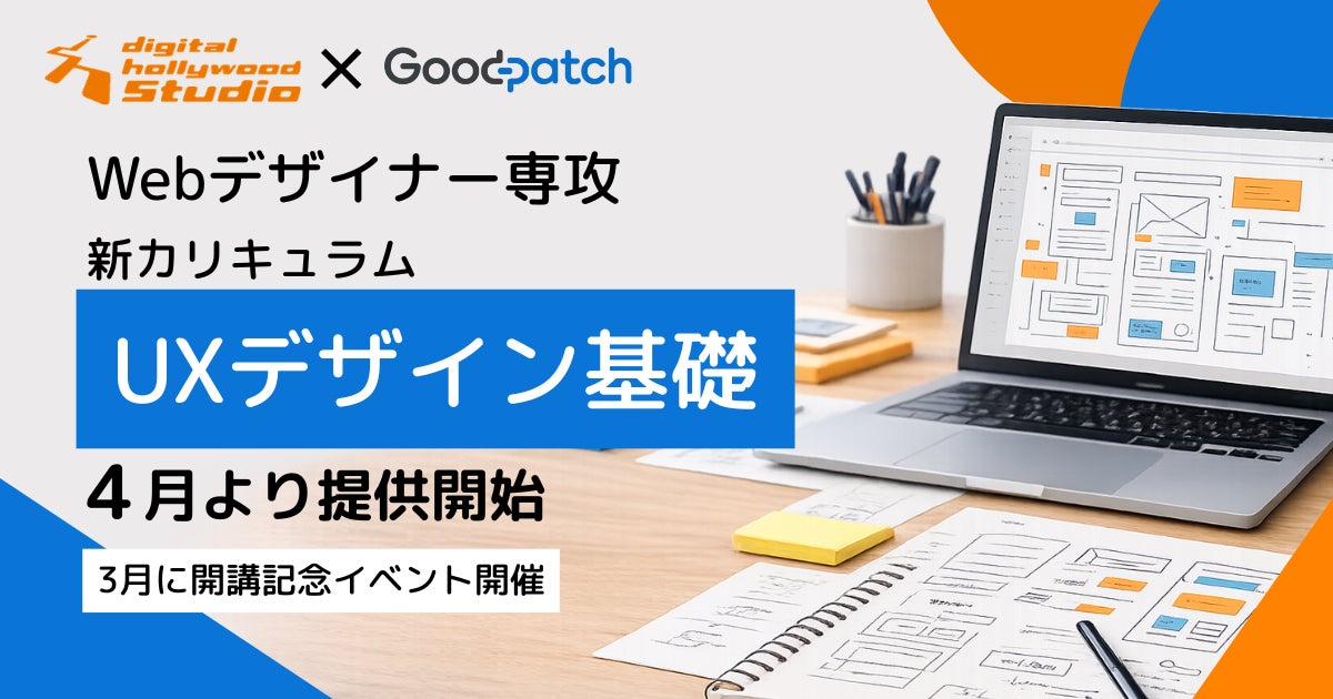 IT関連及びデジタルコンテンツの人材育成スクール、デジタルハリウッド(運営会社:デジタルハリウッド株式会社、本社/本校:東京都千代田区、代表取締役社長兼CEO:藤井雅徳、学長:杉山知之)が運営をする、新しい学びのスタイルを通して多様なライフスタイルを支援し全国へ展開している、Webと動画について学べるラーニングスタジオ『デジタルハリウッドSTUDIO』は、デザイン会社として日本で初めて上場を果たし、企業変革支援やUI/UXデザインなどを行う株式会社グッドパッチ(本社:東京都渋谷区、代表取締役社長:土屋尚史)と共同開発した、「Webデザイナー専攻」向けの新たなカリキュラム「UXデザイン基礎」を、2026年4月より提供開始いたします。