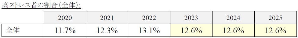 企業が実施するストレスチェックでは、ストレスによる不調が顕著な人や、今後さらに不調が進むリスクが高い人を「高ストレス者」と選定し、医師による面接指導の対象としています。この「高ストレス者」の割合について、2020年から2025年の推移は以下の通りとなり、2023年以降のいわゆるアフターコロナにおいては、横ばいで推移しています。