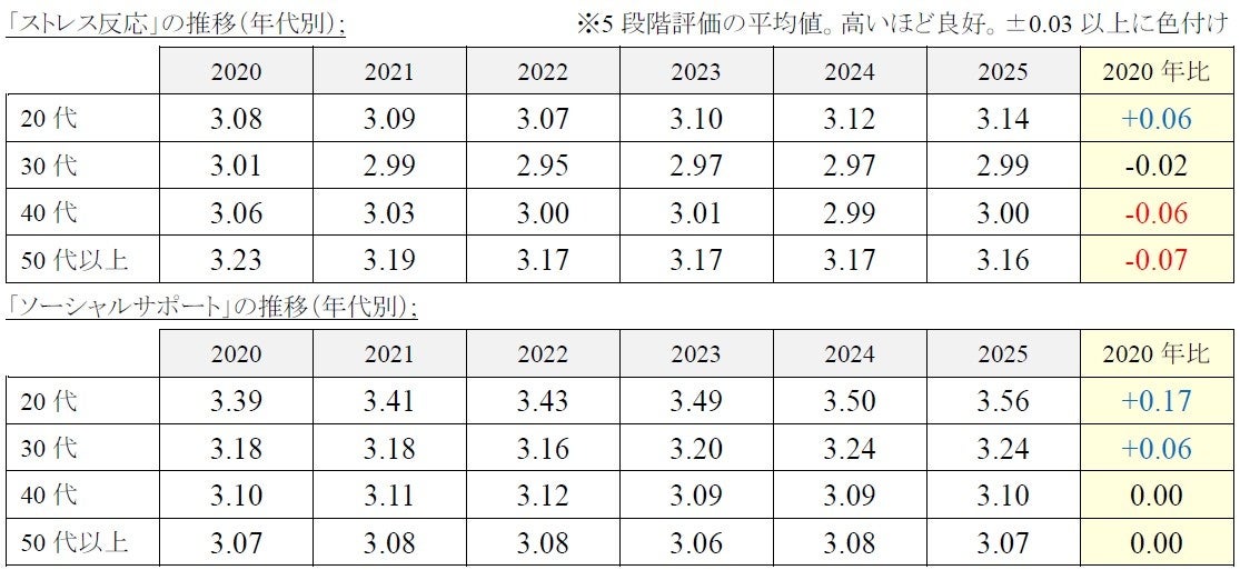 2020年と2025年を比較して、40代・50代以上は、「ストレス反応」が悪化。