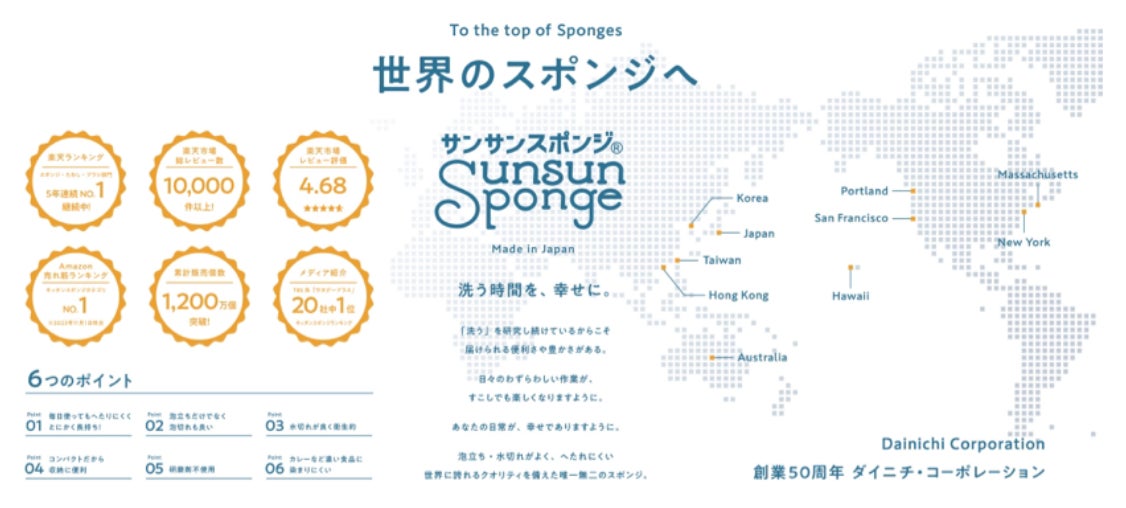 レビューにおいて星5を獲得。海を越えて「洗い物に費やす時間に“ときめき”を」。サンサンスポンジは海外展開を強化し、世界のスポンジへ。