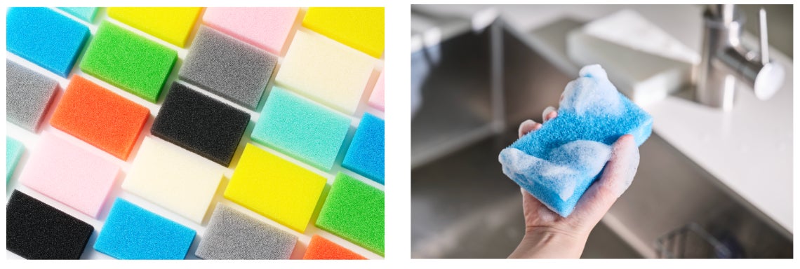ダイニチ・コーポレーションは創業から、食器洗い用固形洗剤の製造販売を行っています。製造から販売を行う中で、固形洗剤と相性の良いスポンジを研究し、高品質ポリウレタンを使用した、従来のスポンジの概念を覆す「サンサンスポンジ」が生まれました。半年以上使えるほど丈夫で長持ちなので、ごみの削減に。
