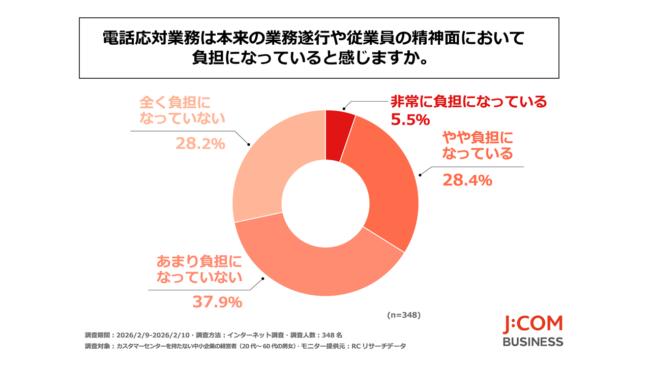 カスタマーセンターを持たない中小企業の経営者の3人に1人以上が、電話応対業務は本来の業務遂行や従業員の精神面において負担になっていると感じている