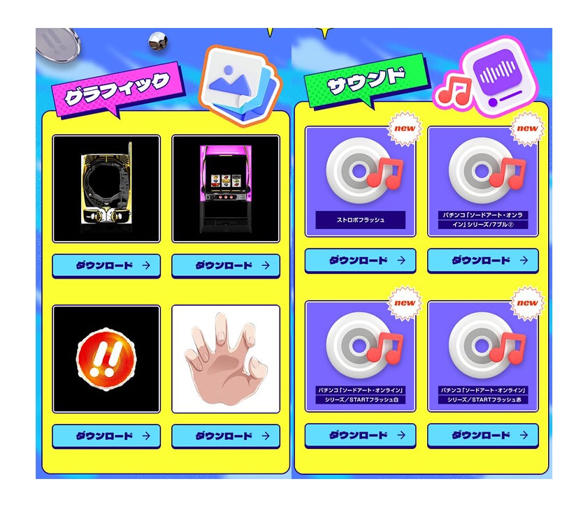 KYORAKUでおなじみの「キュインキュイン♪」音をはじめとする人気機種の効果音や様々なグラフィック、アニメーション素材を豊富にご用意しております。アイテムは今後も定期的に追加していく予定です。