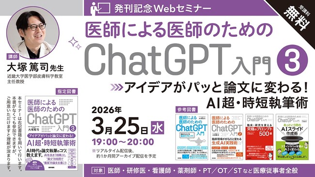 株式会社医学書院 (所在地:東京都文京区、代表取締役社長:金原 俊)は、生成AIを活用した論文作成法を医療者向けに解説する書籍『医師による医師のためのChatGPT入門3―アイデアがパッと論文に変わる!AI超・時短執筆術』(著:大塚篤司)の発刊を記念し、2026年3月25日に無料Webセミナーを開催します。
