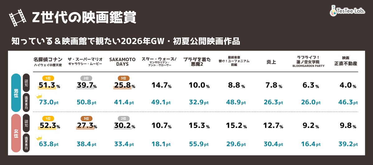 2026年GW・初夏公開映画作品で知っている映画を聴取したところ、男女とも第1位は『名探偵コナン ハイウェイの堕天使』でZ世代の半数以上が認知していることがわかりました。