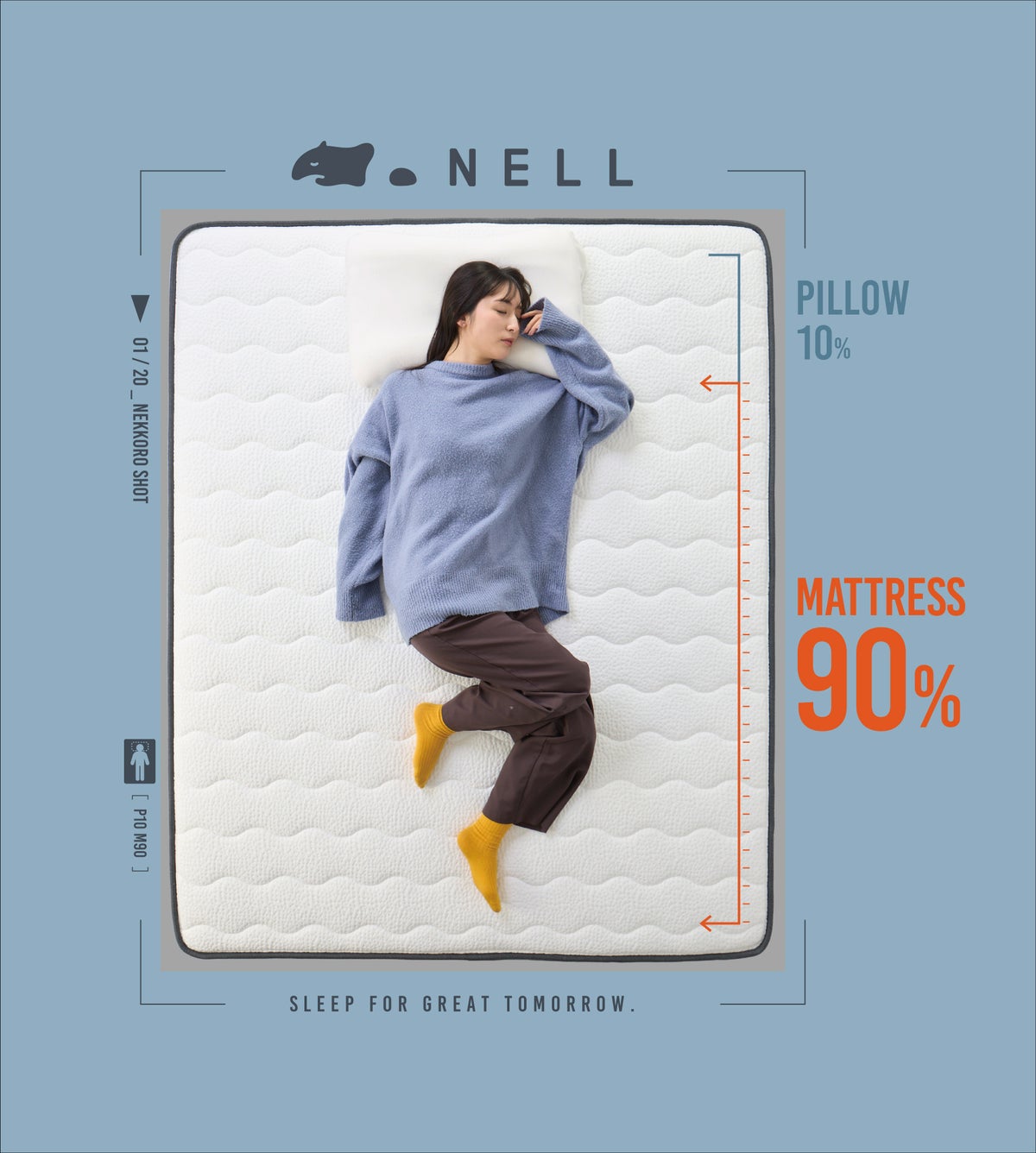 睡眠時、頭の重さは体重のわずか1割。残りの「9割」は、すべてマットレスが支えています。だからこそ、良い睡眠の鍵は枕ではなくマットレスにあるとNELLは考えます。