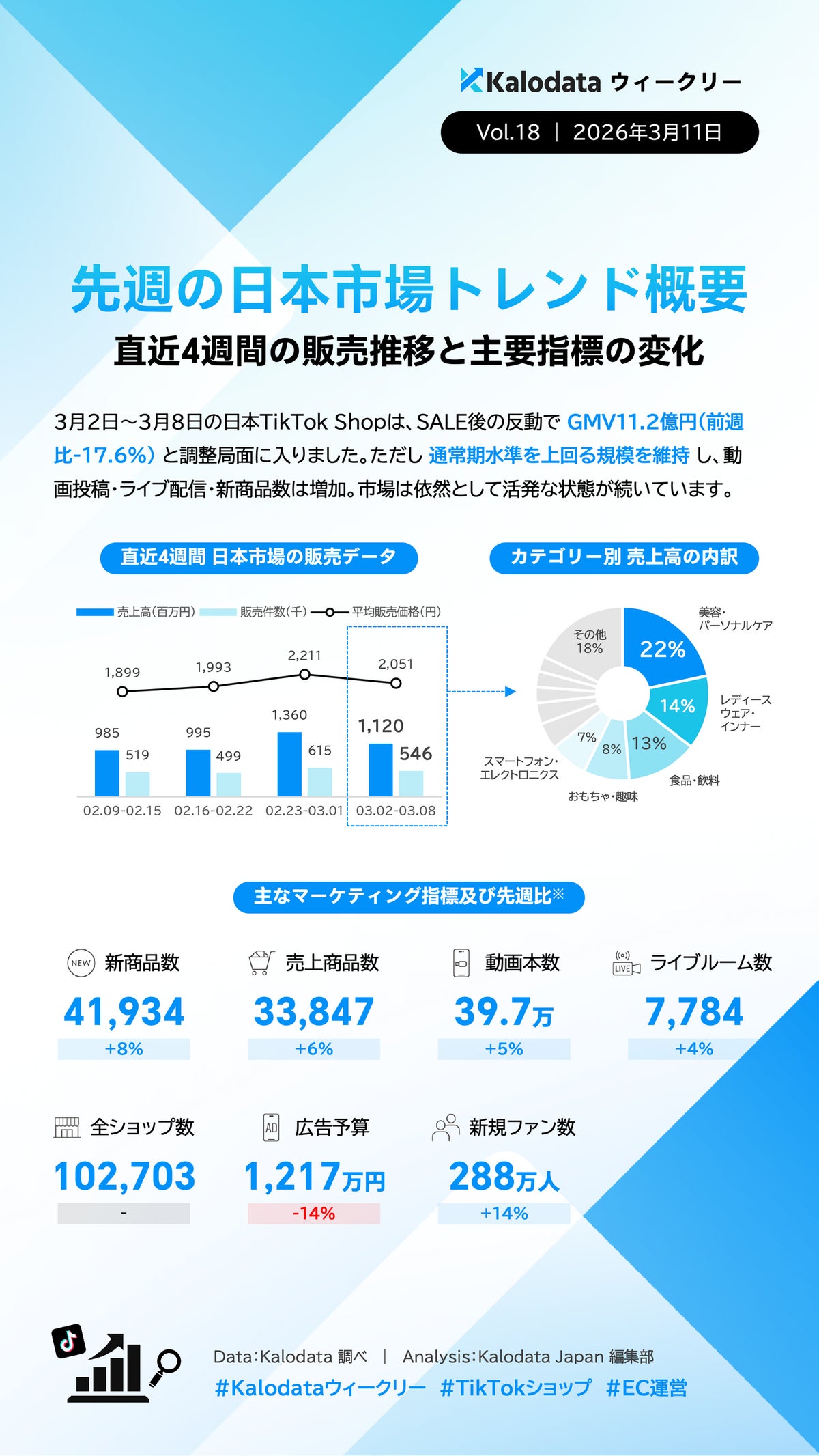 TikTok Shopデータ分析サービスKalodata Japan(運営:株式会社Kalowave Japan)の最新データによると、2026年3月2日~3月8日の日本TikTok Shop市場は前週の大型セールの反動によりGMV11.2億円(前週比−17.6%)となりました。一方、動画投稿・ライブ配信数は増加し、市場活動は依然活発です。カテゴリー別では美容が大きく調整する一方、メンズウェア・玩具・日用雑貨が成長し、春商戦の立ち上がりが確認されました。