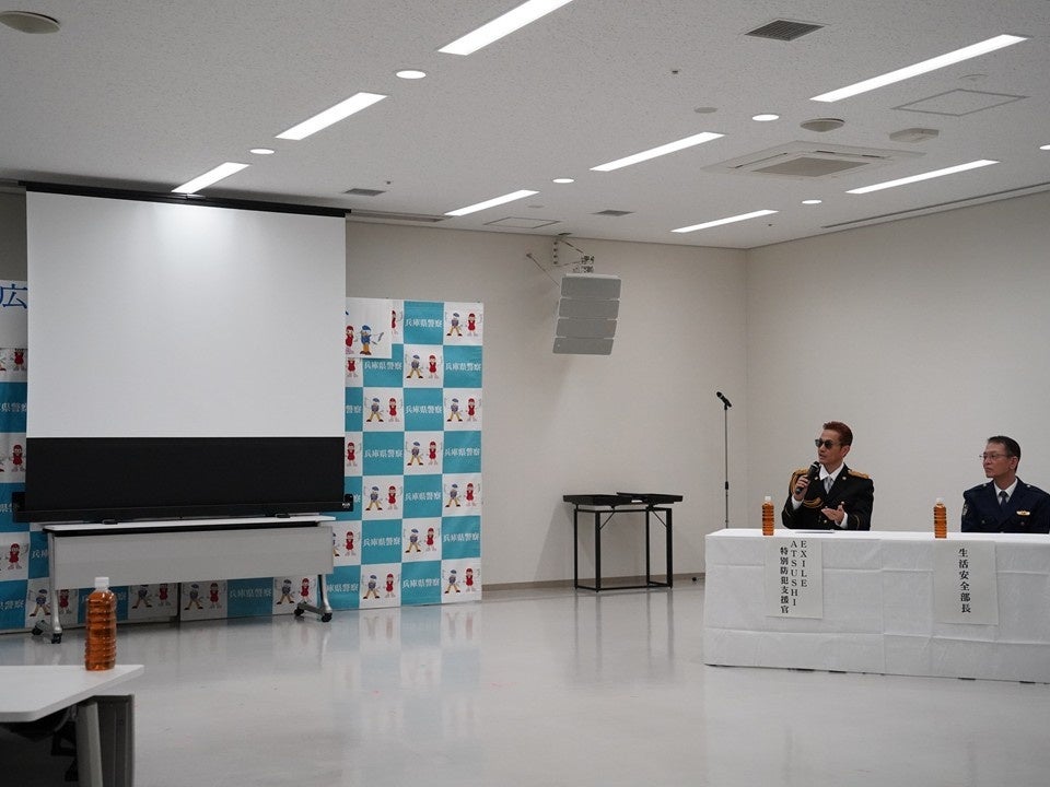 警察庁特別防犯支援官のEXILE ATSUSHI氏が、兵庫県警察が開催した広報啓発動画コンテストの表彰式に特別ゲストとして参加し、受賞した学生たちへの表彰や、防犯知識を深めるクイズセッションが行われました。