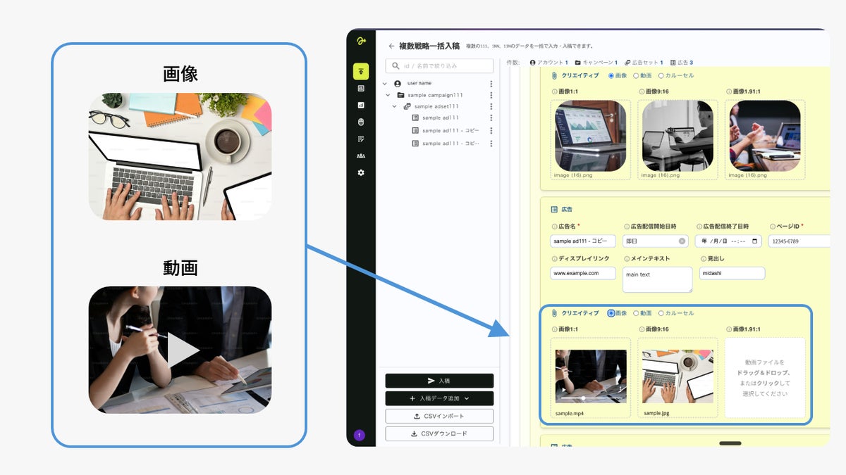 (1)直感的に入稿できる2種類のUI運用担当者が使い慣れた操作性を重視し、スプレッドシート型UIとフォーム型UIといったシンプルで使いやすいインターフェースを採用。案件や作業者の習熟度に合わせて使い分けられ、入稿時の迷いを減らします。また、フォーム型UIでは、Meta、SmartNews、TikTok、LINE広告の一括入稿が可能です。媒体ごとに画面を行き来する手間を抑え、入稿作業をまとめて進められる設計にしています。入稿はステップに沿って進められる設計とし、画像・動画などのクリエイティブ素材もドラッグ&ドロップでアップロードできるため、作業の流れを途切れさせません。