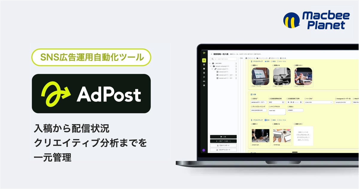 「すべてのマーケティングを成果報酬に」を掲げる株式会社Macbee Planet(本社所在地:東京都渋谷区、代表取締役社長:千葉 知裕、以下「マクビープラネット」)は、MetaをはじめとしたSNS広告に特化した広告運用自動化・効率化ツール「AdPost(アドポスト)」の提供を開始します。複数アカウント・複数広告の同時管理を前提に、入稿プロセスの自動化やエラーチェック、配信状況の可視化などを通じて、運用担当者の作業時間削減と運用品質の安定化を支援します。
