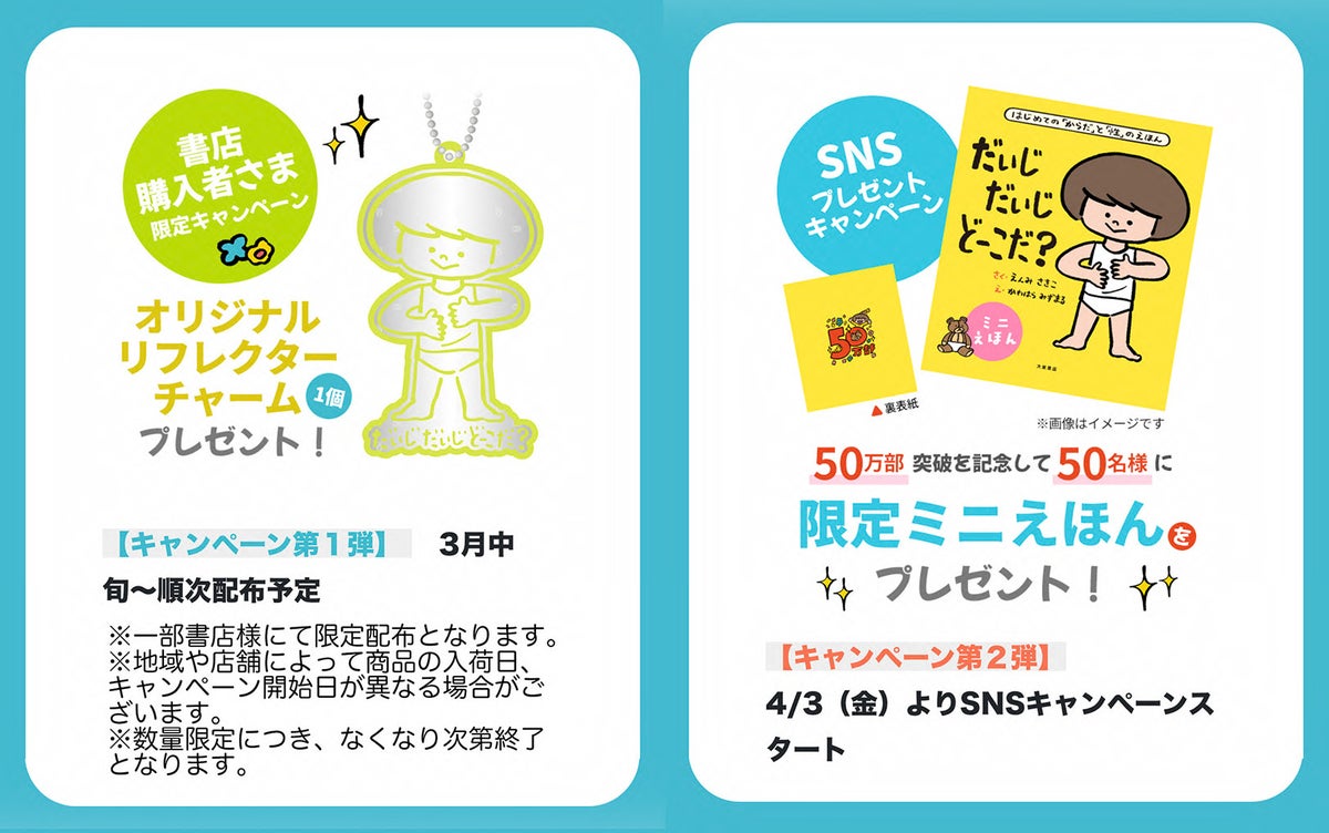 このたび、50万部突破を記念して、以下のキャンペーンを展開します。■書店限定ノベルティ『だいじだいじどーこだ?』オリジナルリフレクターチャーム配布(全国280店舗以上)