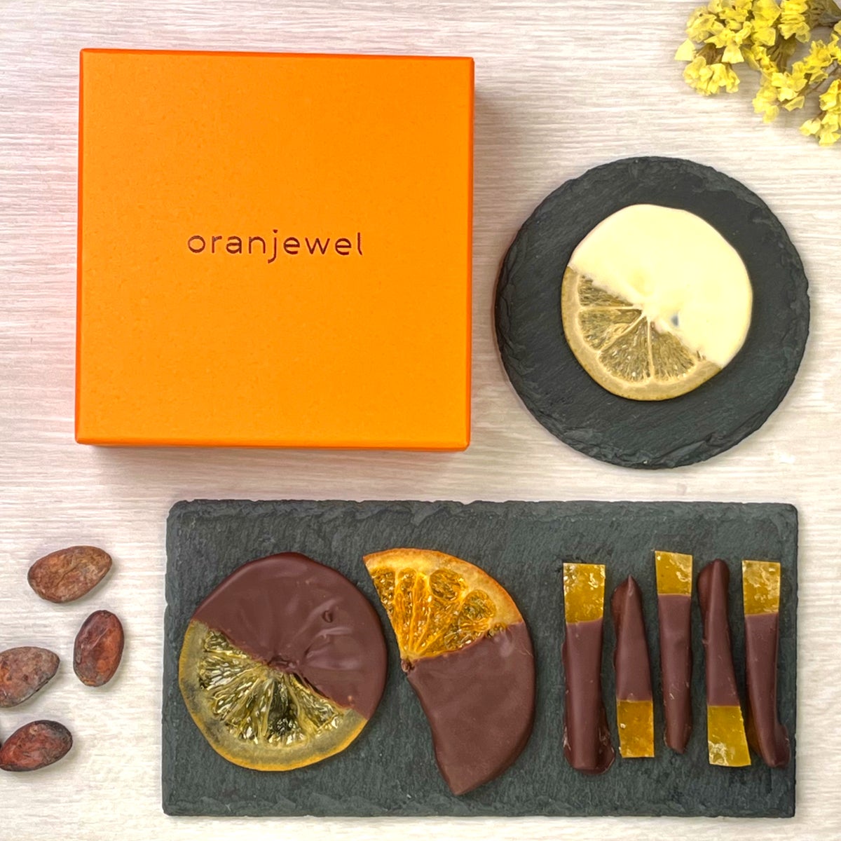 「春らしさ」「爽やかさ」をイメージしたオランジェットのセットです。さまざまな国産の柑橘と、絶品ショコラのマリアージュ。見目麗しい宝石のような色艶で、女性からの人気が非常に高い一品です。