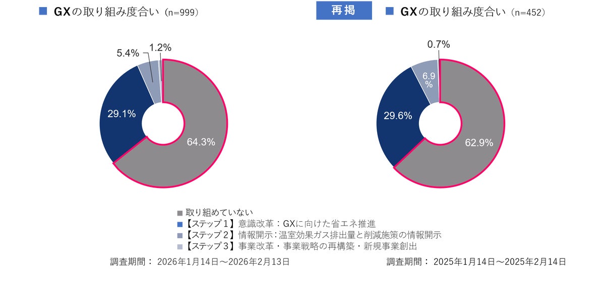これらの結果から、「GXの認知度」と同様に、GXの取り組み状況もこの一年で変化はなく、【ステップ2】以上の取り組みを行う中小企業は1割にも満たないことが明らかになりました。