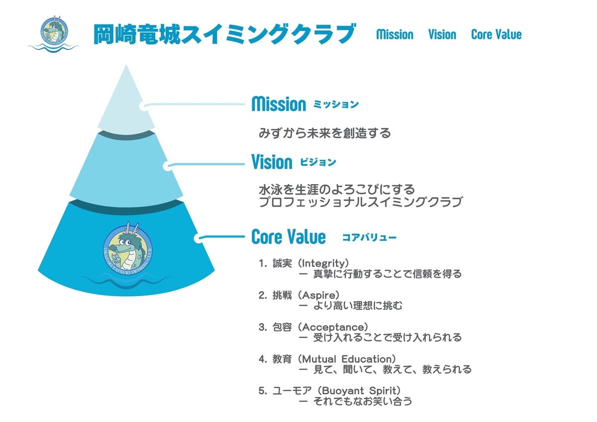 岡崎竜城スイミングクラブ(本社:愛知県岡崎市、代表:大森久美、創業:1973年)は、このたびクラブの理念体系として新たにMVV(Mission・Vision・Value)を策定したことをお知らせいたします。