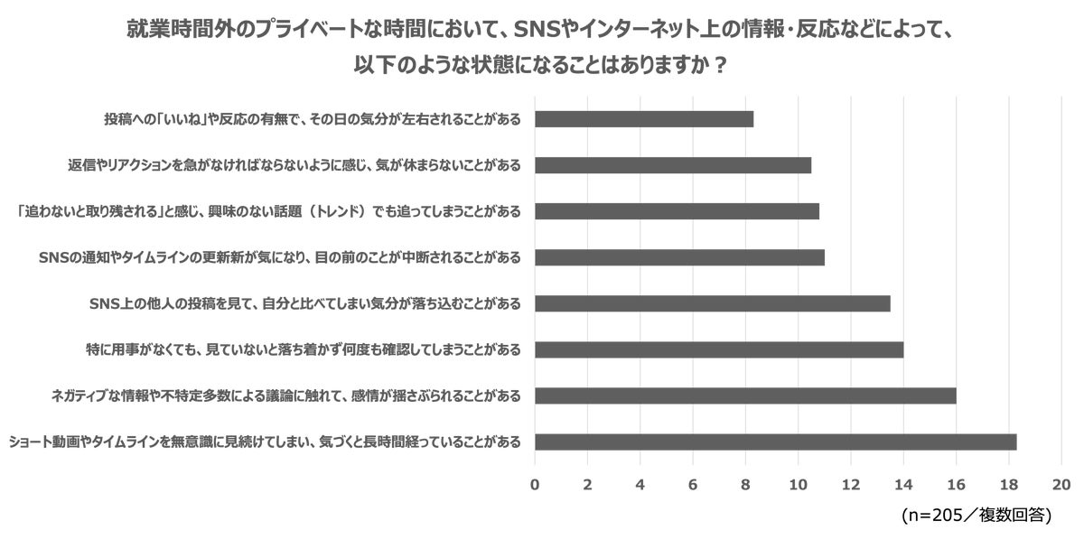 「就業時間外のプライベートな時間において、SNSやインターネット上の情報・反応などによって、選択肢のような状態になることはありますか?」という設問とともに幾つかの選択肢を提示したところ、およそ51%の人は、選択肢のうち1つ以上が当てはまると回答しました。仕事における切り替えのみに限らず、SNSやインターネットが生活の一部となったことによる便利さとは裏腹に心の疲れを感じる人が多くいることが明らかになりました。