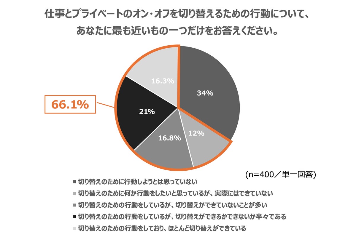 6割以上の人が切り替えのための行動を起こしていますが、切り替えを十分に実感できていない人が大半であり、「切り替えの術」を求めている実態が浮き彫りとなりました。