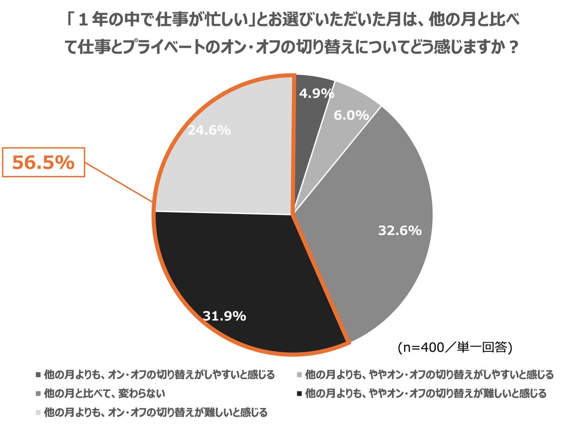 また、「1年の中で、あなたが『仕事が忙しい』と感じる月はいつですか」という問いに対して上位に挙げられたのは「3月(38.0pt)」「12月(35.0pt)」「4月(29.3pt)」でした。「仕事が忙しい月として選んだ月は、他の月と比べて仕事とプライベートのオン・オフの切り替えについてどう感じますか?」と聞いたところ、「忙しい月では他の月よりも、オン・オフの切り替えが難しいと感じる」と回答した人が24.6%、「やや切り替えが難しいと感じる」と回答した人が31.9%と、半数以上の人が通常時よりもオンオフの切り替えが困難であると感じています。