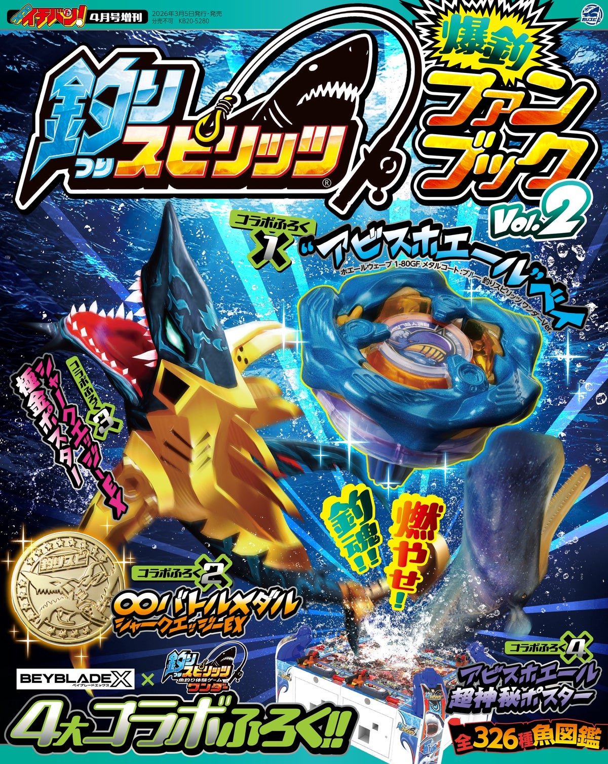 さらに、2026年3月5日(木)より発売中の『釣りスピリッツ 爆釣ファンブックVol.2』では、現代版ベーゴマ『BEYBLADE X(ベイブレードエックス)』(発売元:株式会社タカラトミー)とのコラボ第2弾として『アビスホエール』をモデルにしたコラボベイブレードが付録として登場。